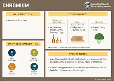 - Stoecker B. Chromium. In: Shils M, Shike M, Ross A, Caballero B, Cousins R, eds. Modern Nutrition in Health and Disease. Philadelphia: Lippincott, Williams & Wilkins; 2006:332-337.
