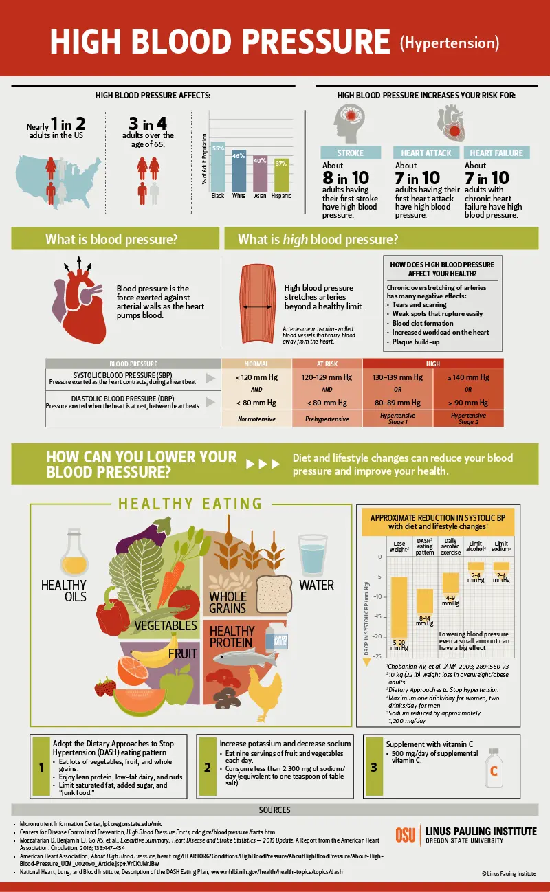 Nutrition can have a significant impact on blood pressure. The DASH eating plan significantly lowers blood pressure in individuals with either normal or high blood pressure. Increasing potassium intake while reducing sodium intake has also been shown to reduce blood pressure. Supplemental vitamin C lowers blood pressure in individuals with normal and high blood pressure, while supplemental riboflavin may lower blood pressure in hypertensive individuals with a certain genetic predisposition. Although the scientific evidence is less consistent for garlic, there is some indication that supplemental garlic preparations may reduce blood pressure in hypertensive individuals.