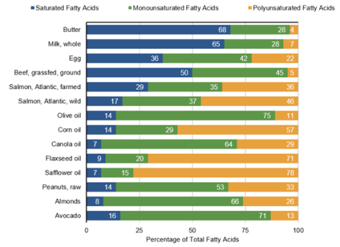 In fact, all dietary fat and oils are a mixture of fatty acids packaged as triglycerides. Some foods, however, have a higher proportion of a certain type of fatty acid. When a food is said to be high in saturated fat (butter, for example), it means it has a high percentage of saturated fatty acids compared to the other types of fatty acids.