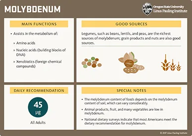 - Food and Nutrition Board, Institute of Medicine. Molybdenum. In: Dietary reference intakes for vitamin A, vitamin K, boron, chromium, copper, iodine, iron, manganese, molybdenum, nickel, silicon, vanadium, and zinc. Washington, D.C.: National Academy Press; 2001:420-441. (National Academy Press)