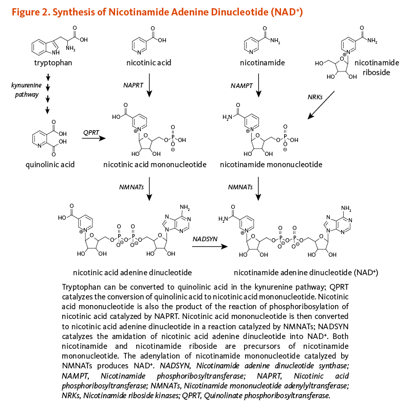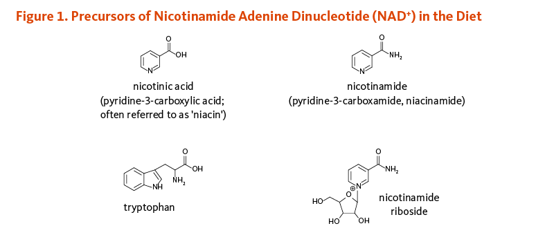 Essential to all forms of life, the nicotinamide coenzyme NAD+ is synthesized in the body from four precursors that are provided in the diet: nicotinic acid, nicotinamide, nicotinamide riboside, and tryptophan (Figure 1).