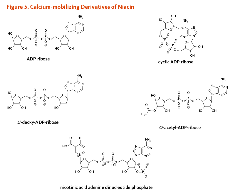 The niacin coenzyme, NAD, is the substrate (reactant) for at least four classes of enzymes. Two classes of enzymes with mono adenosine diphosphate (ADP)-ribosyltransferase and/or poly (ADP-ribose) polymerase activities catalyze ADP-ribosyl transfer reactions. Silent information regulator-2 (Sir2)-like proteins (sirtuins) catalyze the removal of acetyl groups from acetylated proteins, utilizing ADP-ribose from NAD as an acceptor for acetyl groups. Finally, ADP-ribosylcyclases are involved in the regulation of intracellular calcium signaling.
