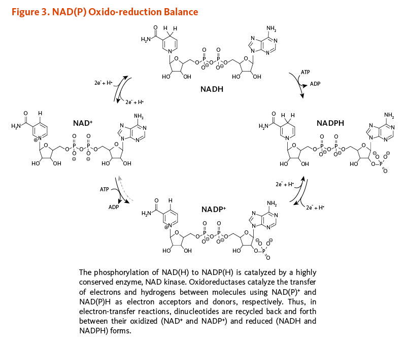 NAD kinase catalyzes the phosphorylation of NAD into NADP using adenosyl triphosphate (ATP) as the phosphoryl donor (3). The oxidation-reduction (redox) properties of the dinucleotide are not affected by the phosphorylation such that the redox pairs NAD+/NADH and NADP+/NADPH show similar redox potentials (4). Oxidation and reduction of the C-4 position of the nicotinamide moiety of NADand its phosphorylated form are essential for electron-transfer reactions supporting vital metabolic and bioenergetic functions in all cells (see Function). Thus, NAD and NADP are recycled back and forth between oxidized (NAD+ and NADP+) and reduced forms (NADH and NADPH), as shown in Figure 3.