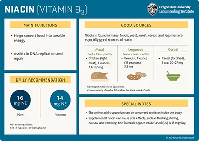 - Minto C, Vecchio MG, Lamprecht M, Gregori D. Definition of a tolerable upper intake level of niacin: a systematic review and meta-analysis of the dose-dependent effects of nicotinamide and nicotinic acid supplementation. Nutr Rev. 2017;75(6):471-490. (PubMed)