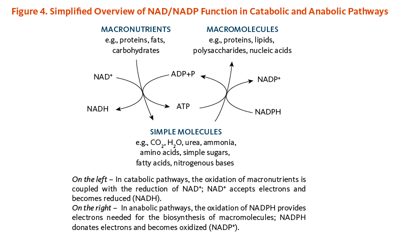 Living organisms derive most of their energy from redox reactions, which are processes involving the transfer of electrons. Over 400 enzymes require the niacin coenzymes, NAD and NADP, mainly to accept or donate electrons for redox reactions (5). NAD and NADP appear to support distinct functions (Figure 4). NAD functions most often in energy-producing reactions involving the degradation (catabolism) of carbohydrates, fats, proteins, and alcohol. NADP generally serves in biosynthetic (anabolic) reactions, such as in the synthesis of fatty acids, steroids (e.g., cholesterol, bile acids, and steroid hormones), and building blocks of other macromolecules (4). NADP is also essential for the regeneration of components of detoxification and antioxidant systems (4). To support these functions, the cell maintains NAD in a largely oxidized state (NAD+) to serve as oxidizing agent for catabolic reactions, while NADP is kept largely in a reduced state (NADPH) to readily donate electrons for reductive cellular processes (4, 6).