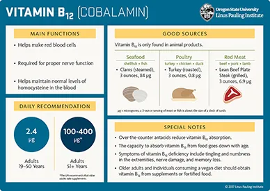 Most people do not have a problem obtaining the RDA of 2.4 μg/day of vitamin B12 from food. According to a US national survey, the average dietary intake of vitamin B12 is 5.9 μg/day for adult men and 3.8 μg/day for adult women. Men and women 60 years or older have average dietary intakes of 5.6 μg/day and 3.7 μg/day, respectively (126). However, consumption of any type of vegetarian diet dramatically increases the prevalence of vitamin B12 deficiency in individuals across all age groups (127, 128). Some foods with substantial amounts of vitamin B12 are listed in Table 2, along with their vitamin B12 content in micrograms (μg). For more information on the nutrient content of specific foods, search USDA’s FoodData Central.